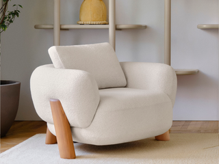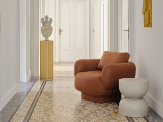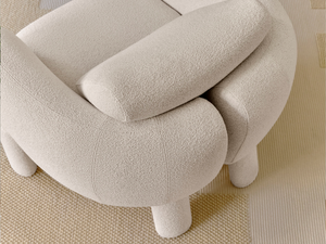 The soft and round shapes of the Anam armchair appear to be sculpted in air, resting on columns as if belonging to a parallel world, reigned by balance.