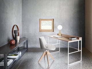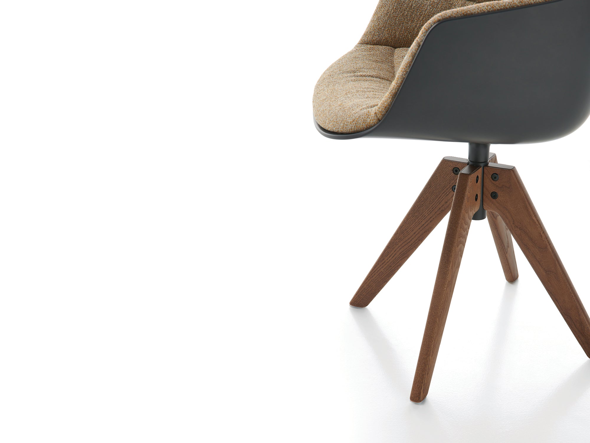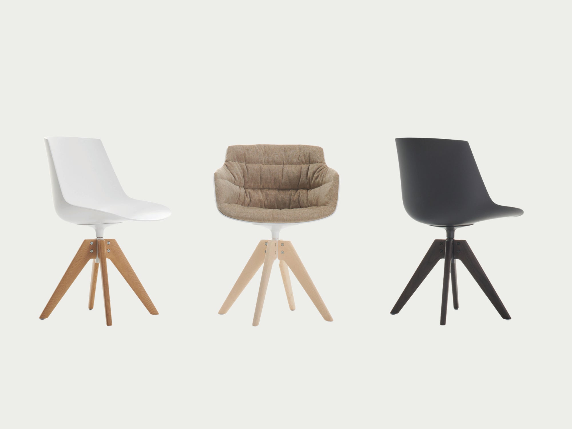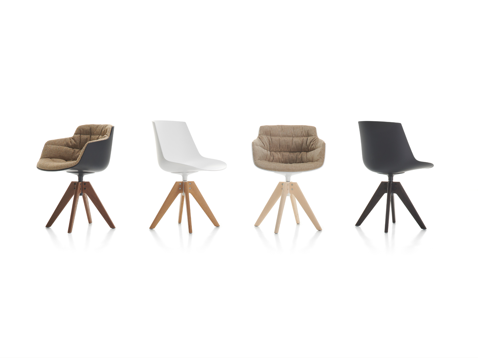 The typological proposal of Flow ranges from Chair to Armchair, including Stool and Pouf. This version, 4 VN wooden legs has a 360° swivel, stained ash, transparent lacquered base.